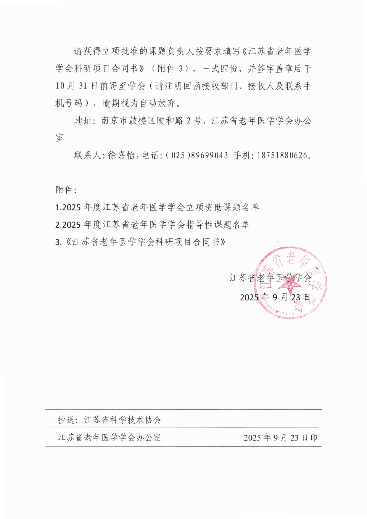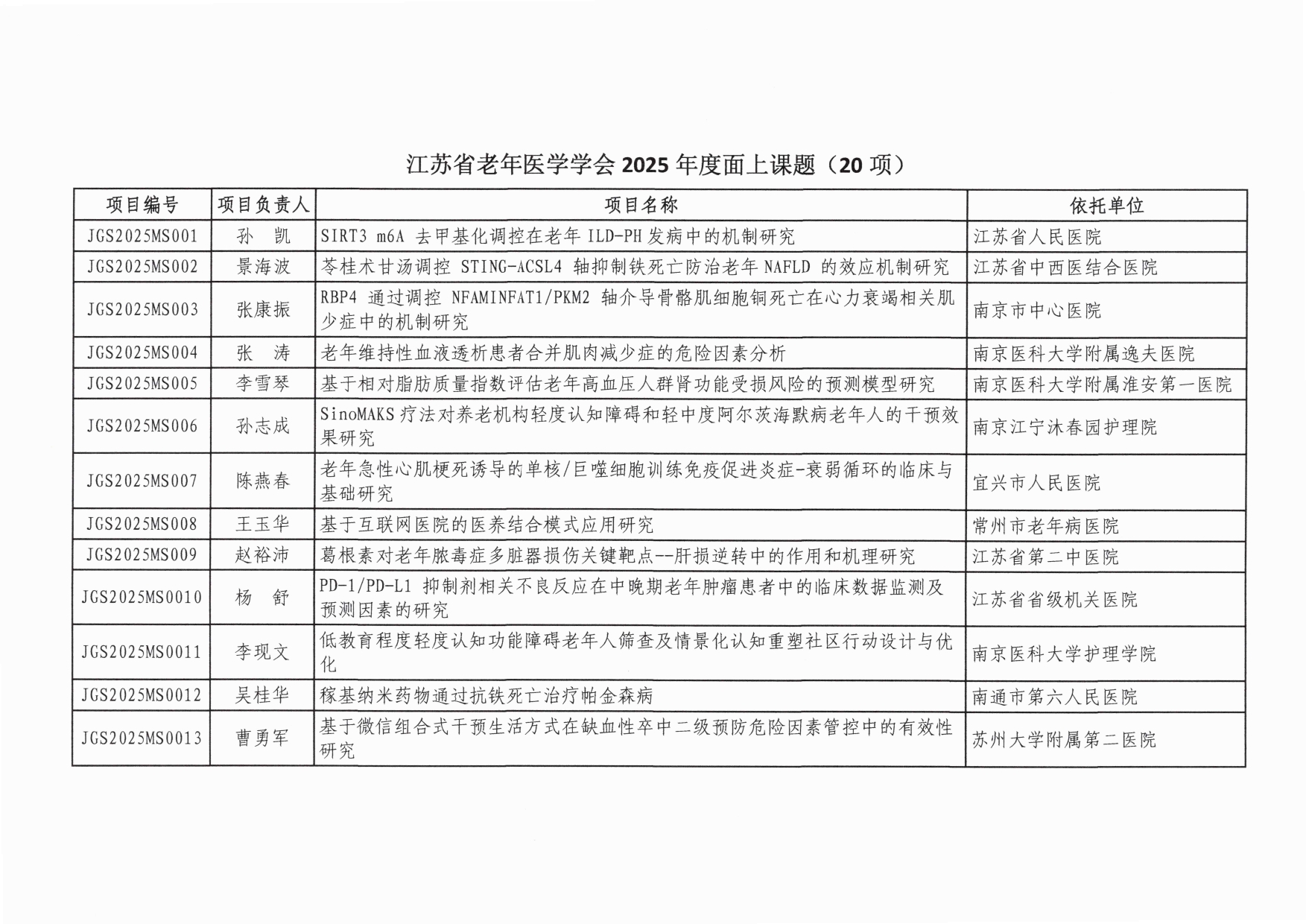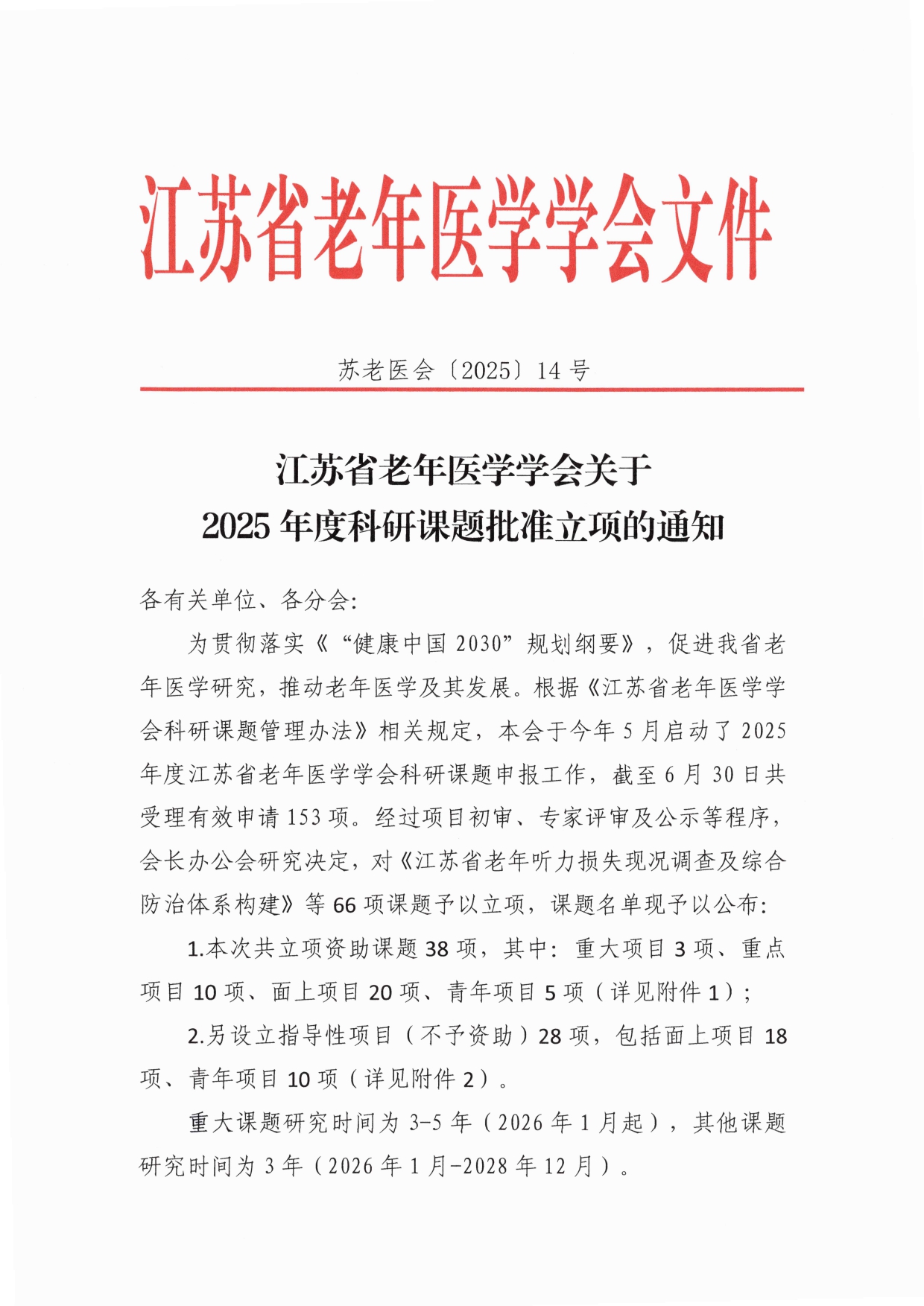 江苏省老年医学学会关于2025年度科研课题批准立项的通知