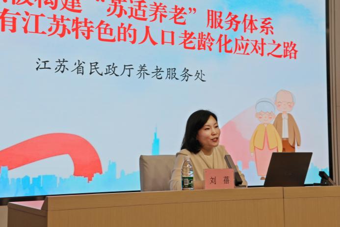 江苏省民政厅养老服务处副处长刘蓓围绕“创新养老服务高质量发展”,指出了江苏省人口老龄化速度快、老龄人口规模大、少子化严重、老龄化结构不平衡等特点,重点阐述了江苏在应对人口老龄化,构建“苏适养老”的探索实践。